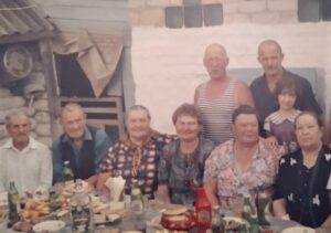 Слева направо — муж сестры прадедушки Сергей, прадедушка Александр, сестра прадедушки Екатерина, бабушка Аня, дедушка Володя, сестра прадедушки Анна, двоюродный брат дедушки Николай с дочерью Светланой, сестра прадедушки Валентина.