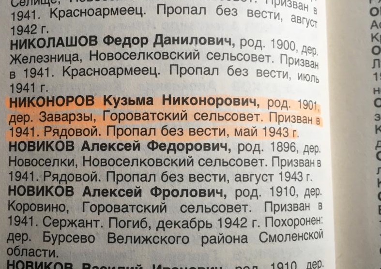 Участник Великой Отечественной войны. Призван в 1941 году и воевал на Смоленщине, где шли очень ожесточённые бои. Очевидцы событий рассказывали родственникам при каких обстоятельствах прапрадедушка пропал без вести: нужно было идти в разведку, чтобы вести полк через минное поле. Двое человек уже пропали без вести и никто не вызывался третьим, было очевидно, что вероятность вернуться живым очень маленькая, но кому-то нужно было рискнуть. Тогда, после молчания всего подразделения, вызвался мой прапрадедушка, несмотря на то, что у него была семья и дома его ждала жена и двое детишек, он пошёл в этот рискованный путь. После этого, его никто не видел… Имя прапрадедушки внесено в «Книгу памяти» Тверской области. Несмотря на то, что награды мне не известны, я им очень горжусь и считаю его мужественным и смелым человеком.