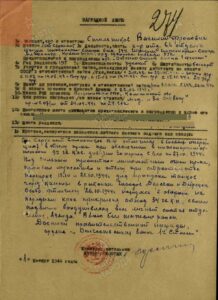Отличился в боевой операции в тылу противника при обеспечении в инженерном отношении 9-ой кав. дивизии. Под сильным пулеметно-минометным огнем противника проявил мужество и отвагу при строительстве переправ для пропуска танков через реку Ю-Буг. В ночь 26.03.1944 года переправлял пехоту 72 гв.с.д. Борясь с быстрым течением мой прапрадедушка перевёз на правый берег 21 человека пехоты и 200 кг. боеприпасов.